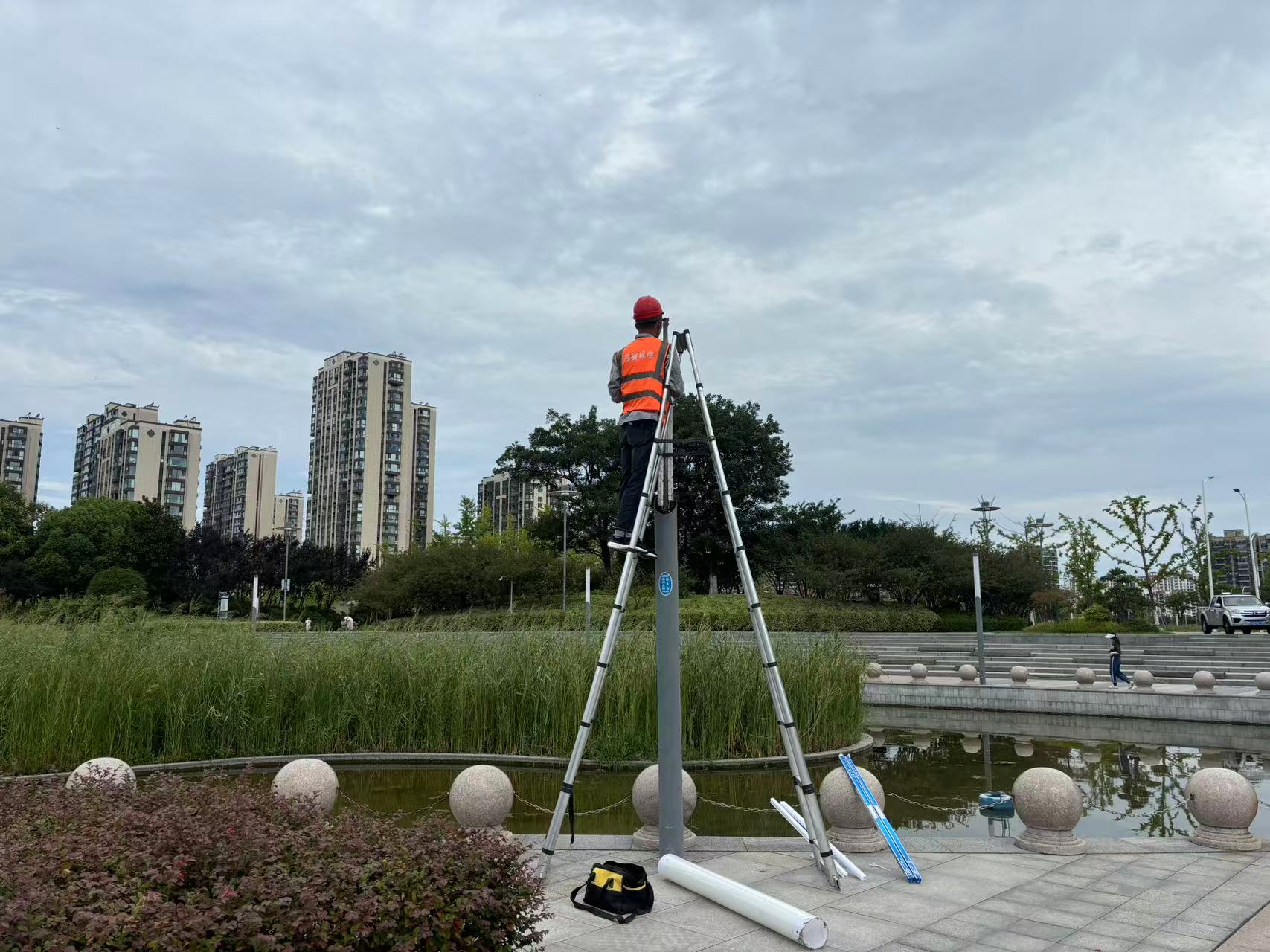 沈剛強介紹:“昨晚巡視發(fā)現(xiàn)蘇州公園大舞臺頂棚部分燈具因高溫?fù)p壞,今天一早我們立即組織維修,確保不影響居民晚上鍛煉。”