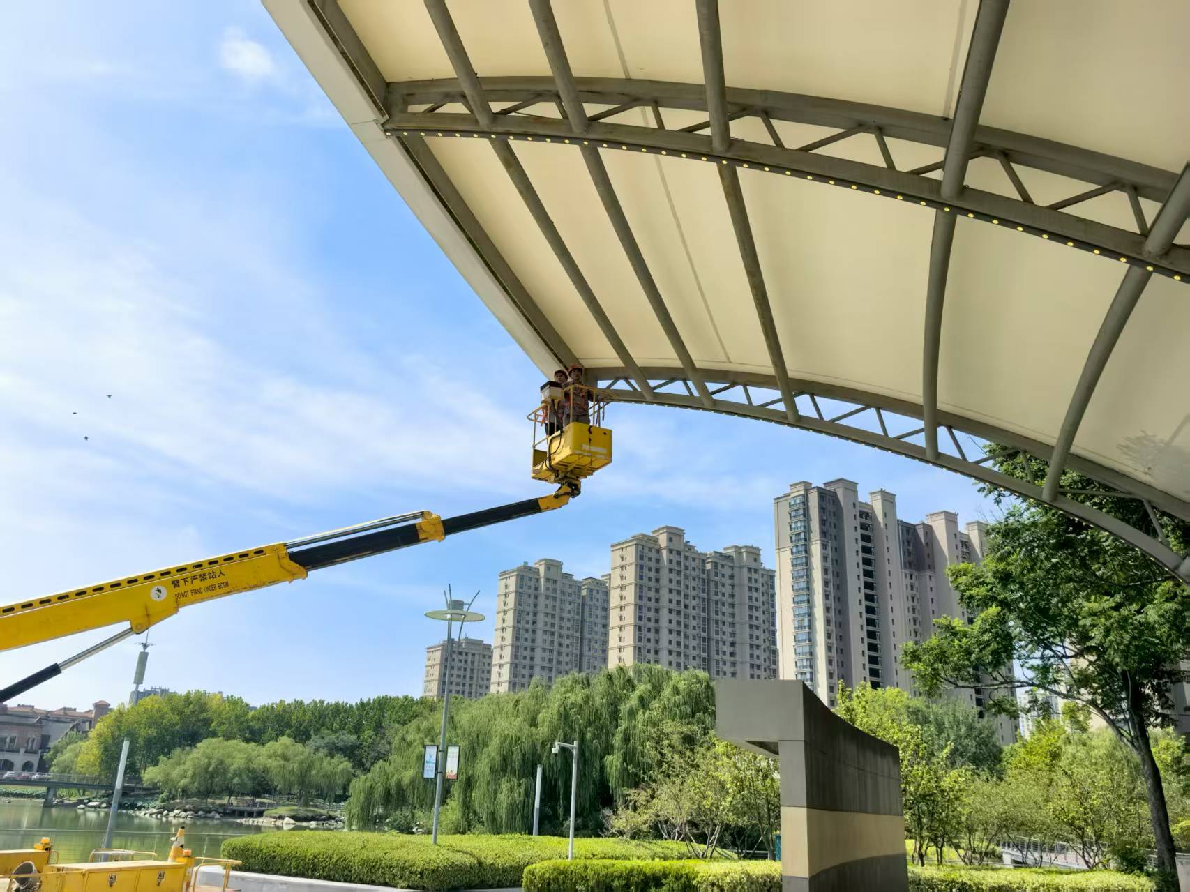 “今天在蘇州公園大舞臺進行登高作業(yè),維修頂部燈光。注意作業(yè)平臺與頂棚保持安全距離……”8月20日上午9點,夏日驕陽似火,蘇州公園作業(yè)現(xiàn)場氣溫已接近37℃。園區(qū)機電維護項目部技術(shù)負(fù)責(zé)人沈剛強和同事們開始了當(dāng)天的第一場高空維修。